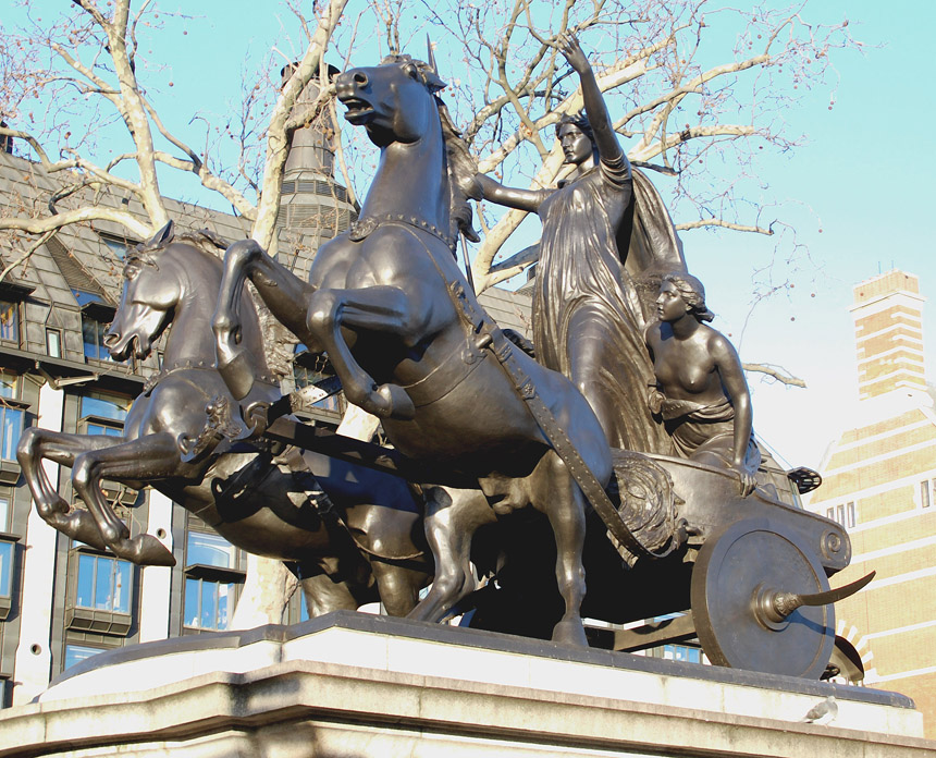 Here is the famous London statue of BOADiCEA on Westminster Bridge opposite the House of Parliament. Created by Victorian sculptor Thomas Thornycroft, it was unveiled in 1902.